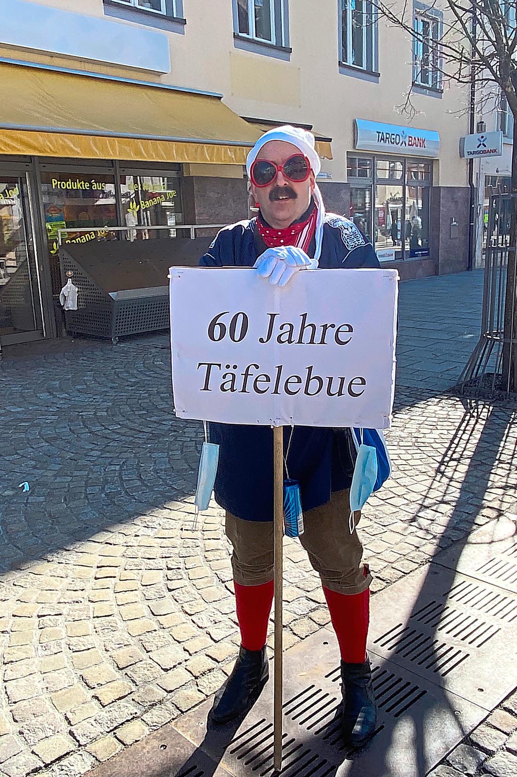 Selbst in schwierigen Zeiten bin ich meiner Pflicht nachgekommen, den Umzug egal wie groß oder klein er sein mag, anzuführen. Als Täfelebue in der 3. Generation stehe ich in der Pflicht. Trotz widrigster Umstände führe ich den Umzug an und damit eine jahrhundertealte Tradition die Tafel voran zu tragen fort.