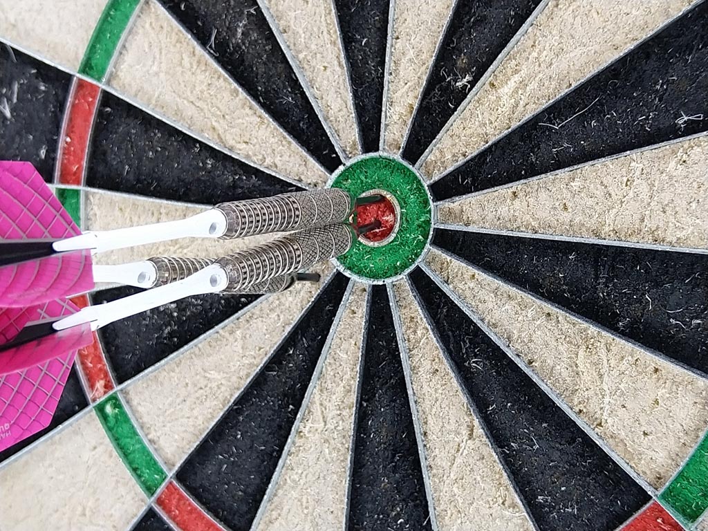 Nachdem ich fast 2 Jahre gebraucht habe um wieder einmal mehr als einen Dart ins Bulls Eye zu werfen, traf ich endlich wieder mit zwei Darts ins Bulls Eye. Und der andere war auch nicht weit weg. Außerdem sieht man meine neuen, schönen pinkfarbenen Flights. :-)